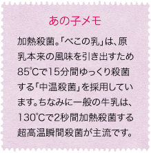 一般的な牛乳は、130度の高温で2秒という超高温で殺菌します。「べこの乳」は、原乳本来の風味を生かした「保持式」という方法で殺菌します。専用のタンクを使い85度で15分かけてゆっくり殺菌することで、鍋でとろとろ沸かして殺菌していた頃の甘み、コクを再現しました。