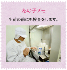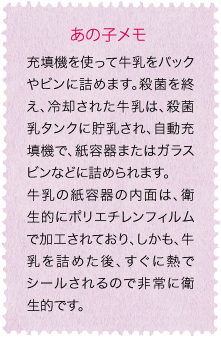 細菌などの数や風味及び抗菌性物質の有無等30項目のチェック。厳しい検査をクリアした原乳のみ工場のタンクへ移し、すぐに5度以下に冷します。その後、牛乳をパックやビンに詰める「充填機」に牛乳が入る前にも検査、出荷の前にも「製品検査」を行い「安全」「安心」「おいしい」牛乳を届けます。